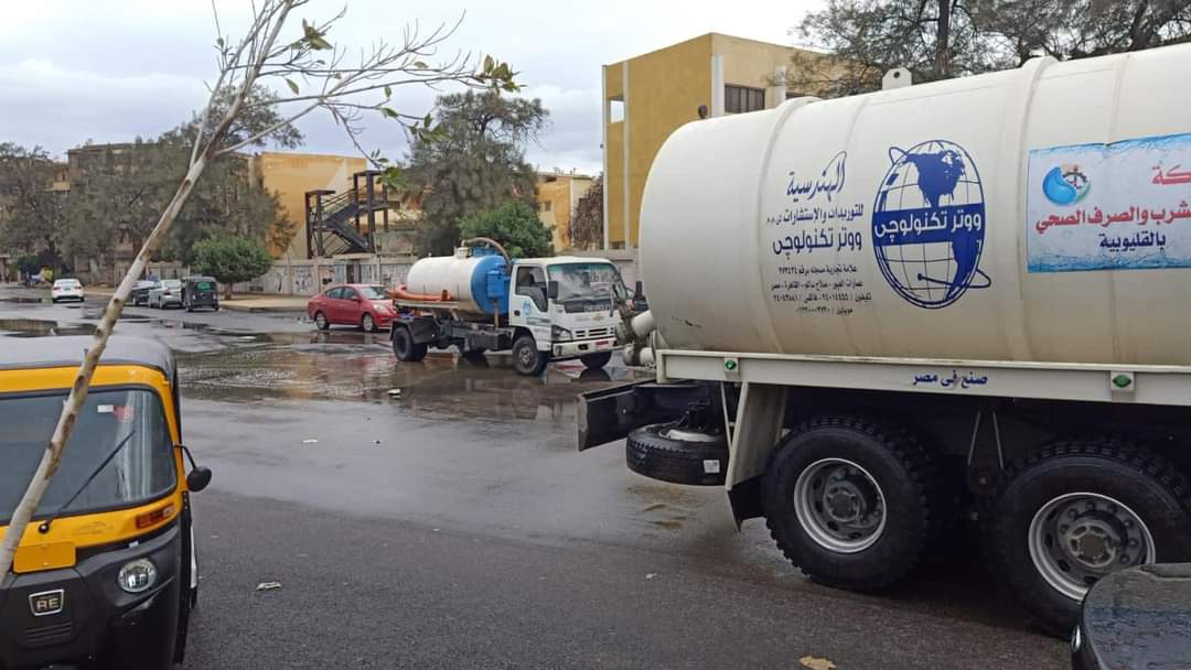 استمرت شركة مياة الشرب والصرف الصحي بـ القليوبية في رفع تجمعات مياه الأمطار وتكثيف المرور بالشوارع والميادين لرفع مياه الأمطار وتطهير بالوعات صرف الأمطار لاستيعاب كميات المياه المتساقطة بشوارع المحافظة.