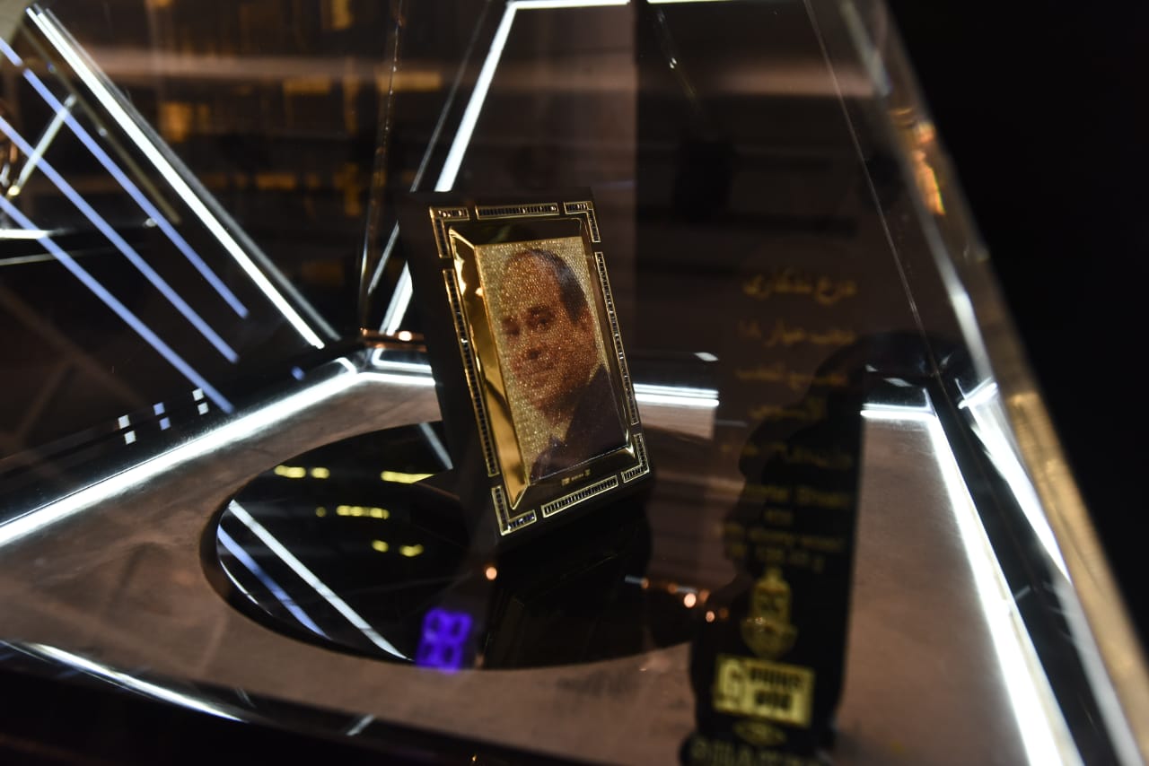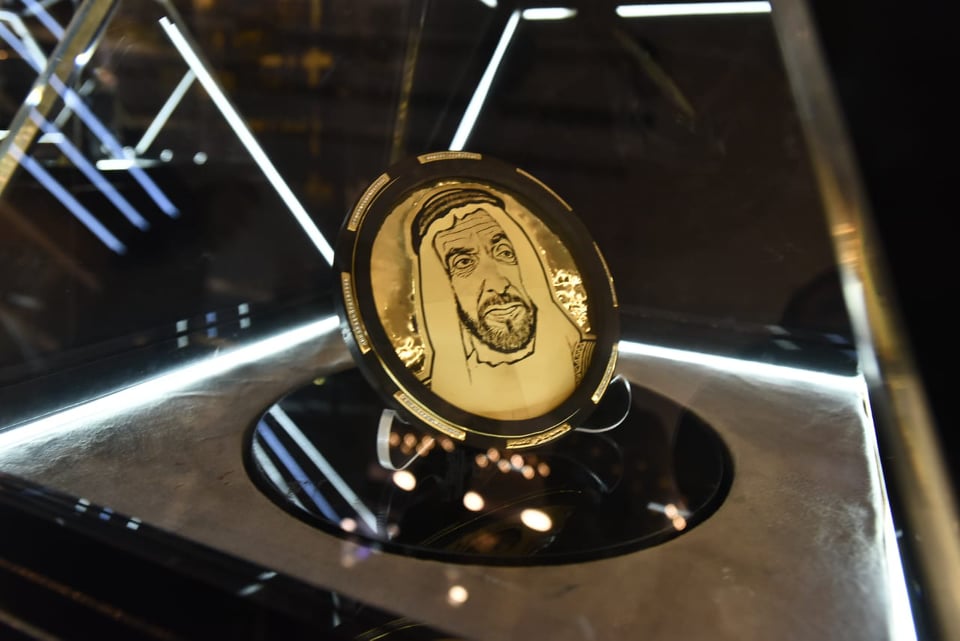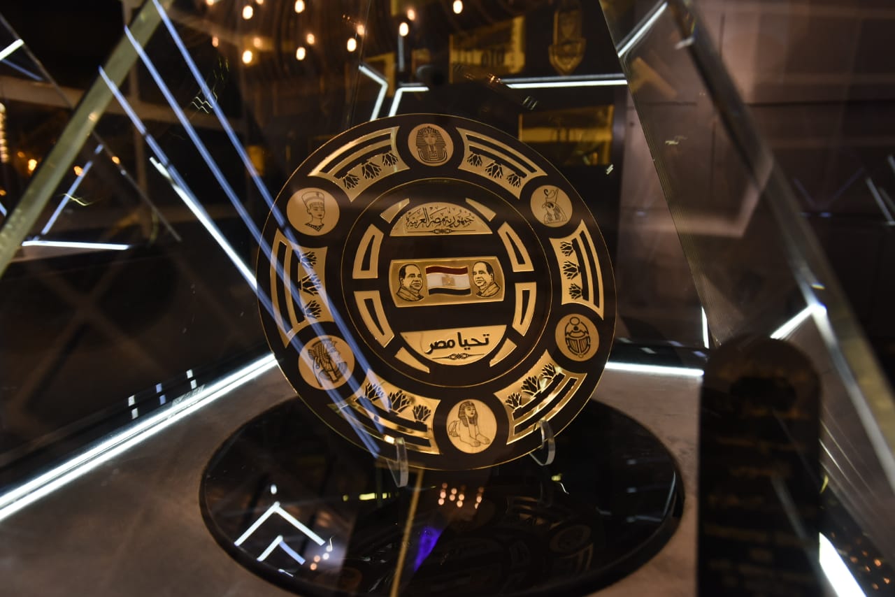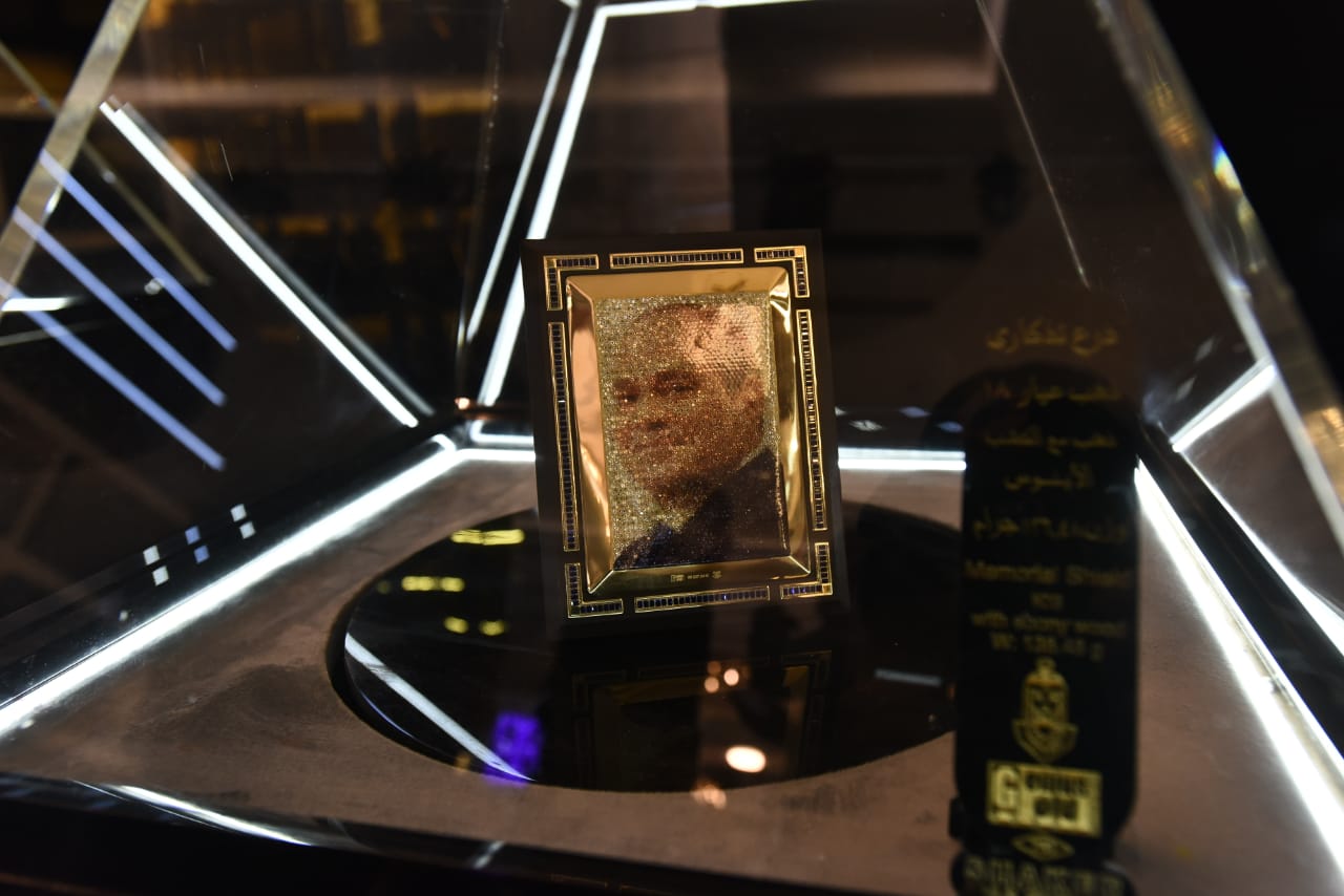 واستوقف الزائرون صورة للرئيس عبد الفتاح السيسي بالذهب داخل المعرض وكذلك صورة أخرى لطبق ذهبي تتوسطه صورة للرئيس السيسي وعلم تحيا مصر، بالإضافة إلى صورة أخرى ذهبية للشيخ زايد بن سلطان ضمن مجموعة من المشغولات الذهبية.