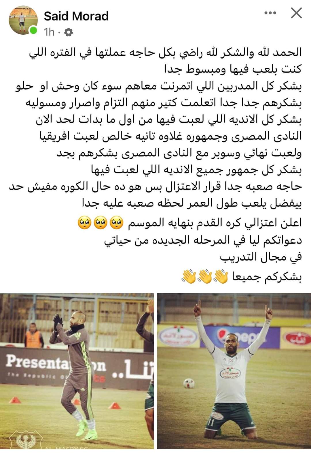 أعلن سعيد مراد لاعب المصري السابق اعتزاله كرة القدم اليوم السبت وذلك خلال منشور على صفحته الشخصية عبر موقع فيس بوك.