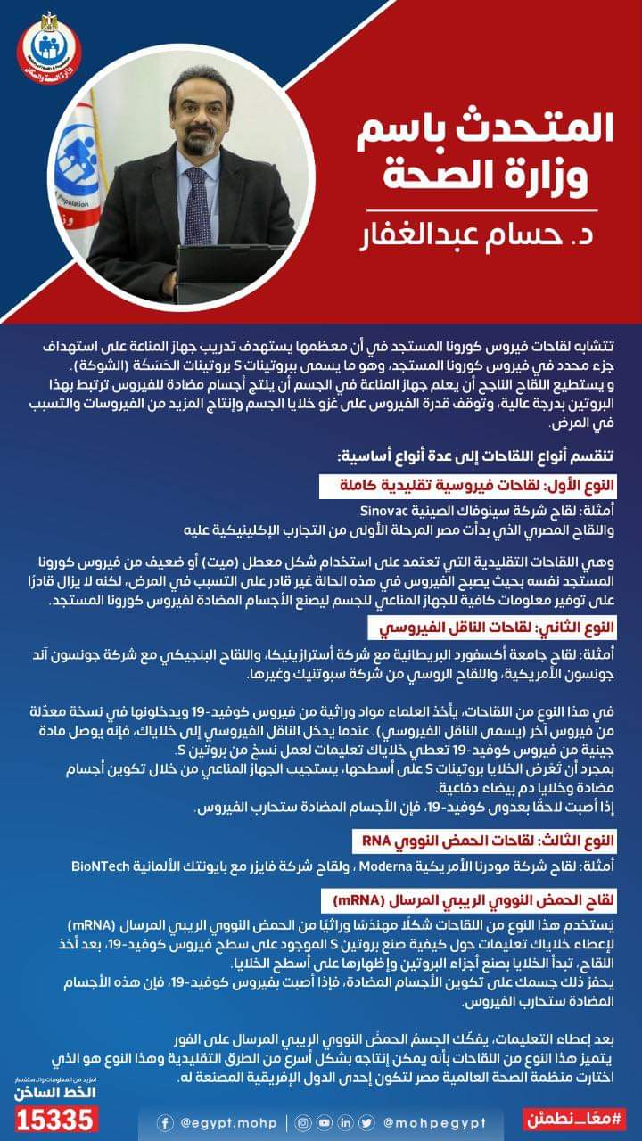 قال الدكتور حسام عبد الغفار المتحدث الرسمي بوزارة الصحة إن لقاحات فيروس كورونا تتشابه في أنها تستهدف تدريب جهاز المناعة على استهداف جزء محدد في فيروس كورونا مسئول عن تكاثر الفيروس.