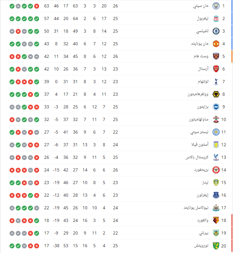 وجاء ترتيب الدوري الإنجليزي كالتالي: