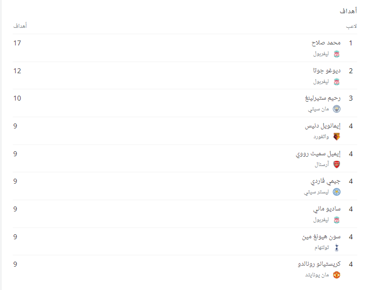 رفع محمد صلاح لاعب المنتخب الوطني وليفربول، رصيده من الأهداف في الموسم الحالي من الدوري الإنجليزي إلى 17 هدفا، ليتسع الفارق بينه وبين أقرب منافسيه ديوجو جوتا زميله في الفريق.