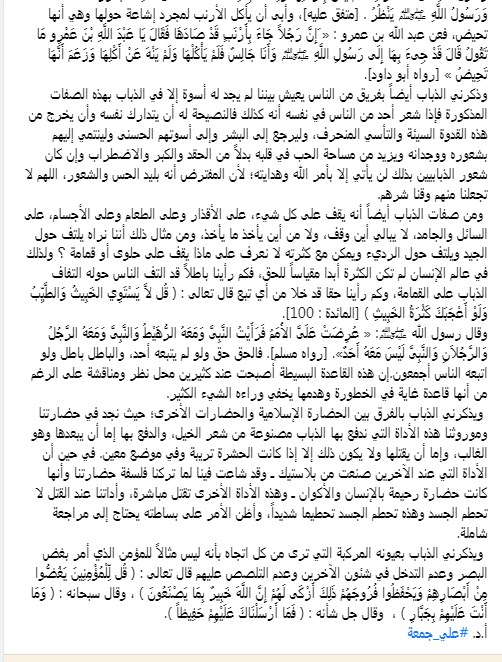 وتابع: "ومن صفات الذباب أيضًا أنه يقف على كل شيء، على الأقذار وعلى الطعام وعلى الأجسام، على السائل والجامد، لا يبالي أين وقف، ولا من أين يأخذ ما يأخذ، ومن مثال ذلك أننا نراه يلتف حول الجيد ويلتف حول الرديء ويمكن مع كثرته لا نعرف على ماذا يقف على حلوى أو قمامة؟ ولذلك في عالم الإنسان لم تكن الكثرة أبدا مقياسًا للحق، فكم رأينا باطلًا قد التف الناس حوله التفاف الذباب على القمامة، وكم رأينا حقا قد خلا من أي تبع قال تعالى: ﴿ قُل لاَّ يَسْتَوِي الخَبِيثُ وَالطَّيِّبُ وَلَوْ أَعْجَبَكَ كَثْرَةُ الخَبِيثِ﴾ [المائدة: 100].