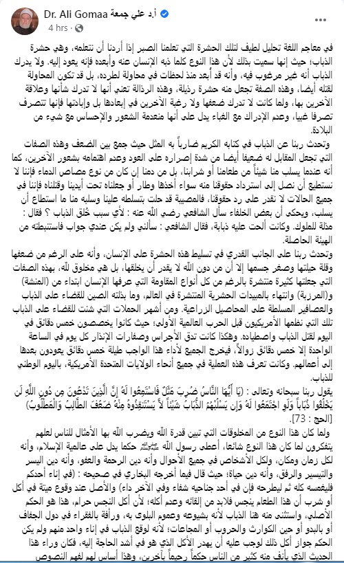 وكتب الدكتور علي جمعة تدوينة على الفيس بوك "في معاجم اللغة تحليل لطيف لتلك الحشرة التي تعلمنا الصبر إذا أردنا أن نتعلمه، وهي حشرة الذباب؛ حيث إنها سميت بذلك لأن هذا النوع كلما ذبه الإنسان عنه وأبعده فإنه يعود إليه. ولا يدرك الذباب أنه غير مرغوب فيه، وأنه قد أُبعد منذ لحظات في محاولة لطرده، بل قد تكون المحاولة لقتله أيضا، وهذه الصفة تجعل منه حشرة رذيلة، وهذه الرذالة تعني أنها لا تدرك شأنها وعلاقة الآخرين بها، ولما كانت لا تدرك ضعفها ولا رغبة الآخرين في إبعادها بل وإبادتها فإنها تتصرف تصرفا غبيا، وعدم الإدراك مع الغباء يدل على أنها منعدمة الشعور والإحساس مع شيء من البلادة".