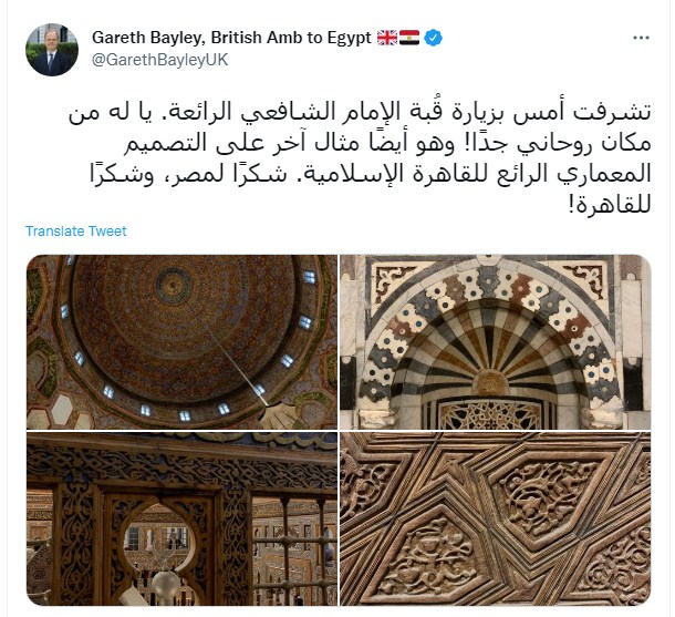 وكتب السفير جاريث بايلي تغريدة على تويتر "تشرفت أمس بزيارة قُبة الإمام الشافعي الرائعة. يا له من مكان روحاني جدًا. وهو أيضًا مثال آخر على التصميم المعماري الرائع للقاهرة الإسلامية. شكرًا لمصر، وشكرًا للقاهرة".