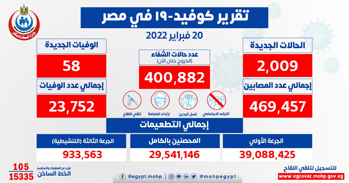 وأوضح الدكتور حسام عبد الغفار المتحدث الرسمي لوزارة الصحة والسكان، أنه تم تسجيل 2009 حالة جديدة ثبتت إيجابية تحاليلها للفيروس ومتحوراته، وذلك ضمن إجراءات الترصد والتقصي والفحوصات اللازمة التي تُجريها الوزارة وفقًا لإرشادات منظمة الصحة العالمية، لافتًا إلى وفاة 58 حالة جديدة.