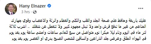 وكتب هاني الناظر تدوينة على الفيس بوك "عليك باربعة وحافظ على صحة الجلد والقلب والكلى والعظام والرئة والاعصاب وقوي جهازك المناعي من غير ما تدفع قرش واحد ولا تبذل مجهود كبير ولا تتعطل عن شغلك.. اشرب ثلاثة لتر ماء في اليوم ونام ليلا مبكرا نوم متواصل من سبع لثماني ساعات وامشي ساعة يوم بعد يوم في الهواء الطلق وعرض جلد الذراعين والساقين للشمس الصبح بدري او العصر يوم بعد يوم".