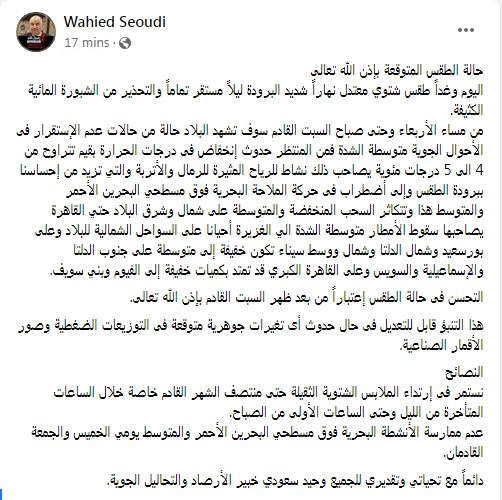 وكتب وحيد سعودي تدوينة على "الفيس بوك" عن توقعاته لـ حالة الجو في الأيام المقبلة فقال: "حالة الطقس المتوقعة بإذن الله تعالى.. اليوم وغدًا طقس شتوي معتدل نهارًا شديد البرودة ليلًا مستقر تمامًا والتحذير من الشبورة المائية الكثيفة."
