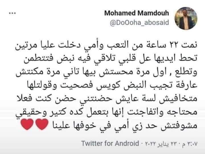 وسادت حالة من الحزن بين وسائل التواصل الاجتماعي إثر تداول صورة من بوست قديم الشهر الماضي للطبيب محمد ممدوح النائب بقسم النساء بمستشفى النساء الجامعي عن متابعة والدته بعد نومه 22 ساعة من تعب العمل وملاحظته والدته وهي تضع يدها على قلبه للتأكد من وجود نبض وخوفها من فترة نومه حتى استيقظ وقال لها متخافيش لسه عايش فحضنته قائلا مشفتش حد زي امي في خوفها علينا