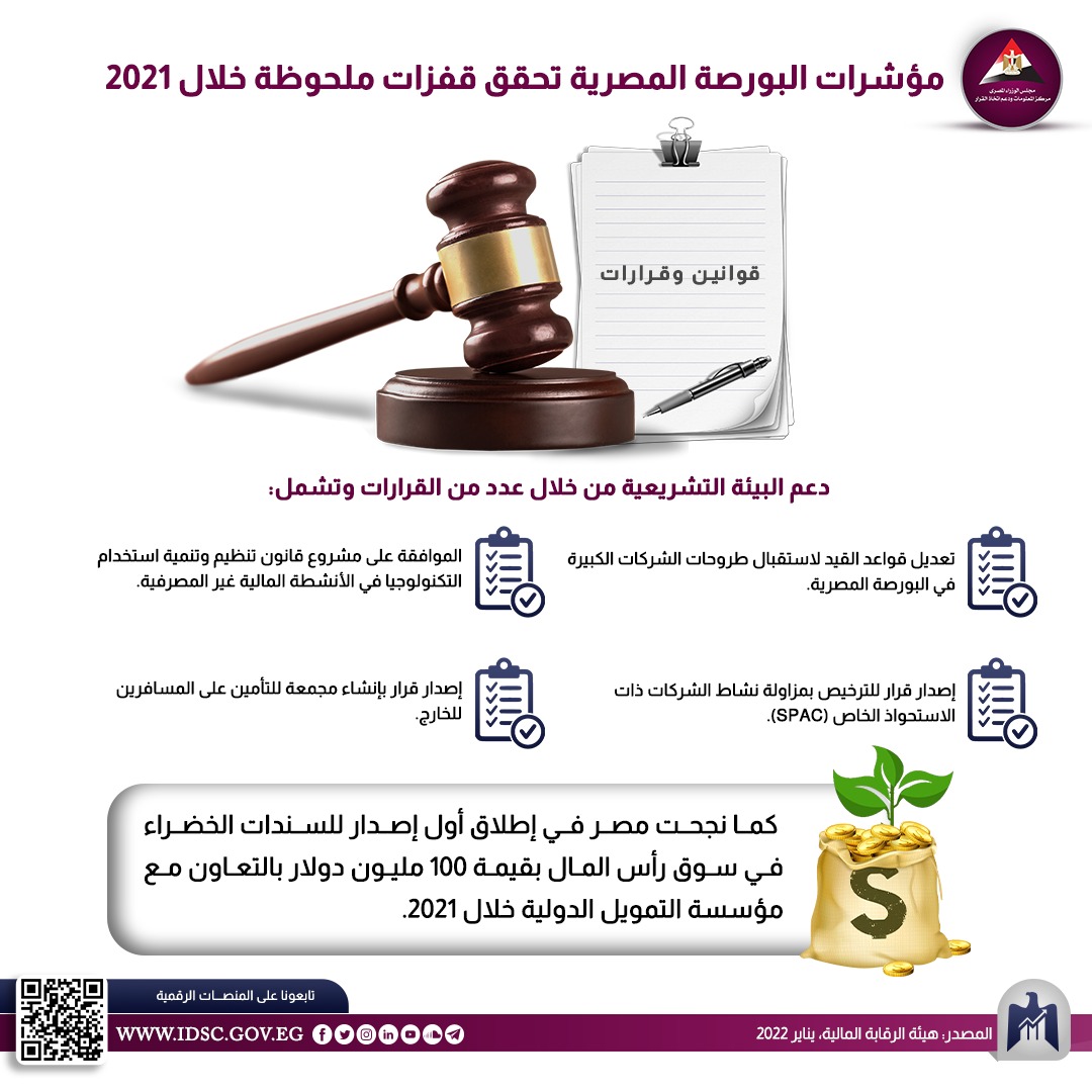 شهدت مؤشرات البورصة المصرية ارتفاعًا ملحوظًا خلال عام 2021 مدفوعة بذلك بالإجراءات التي اتخذتها الدولة المصرية لدعم البورصة على المستوى التشريعي بالإضافة إلى برنامج الطروحات الحكومية للشركات المملوكة للدولة.