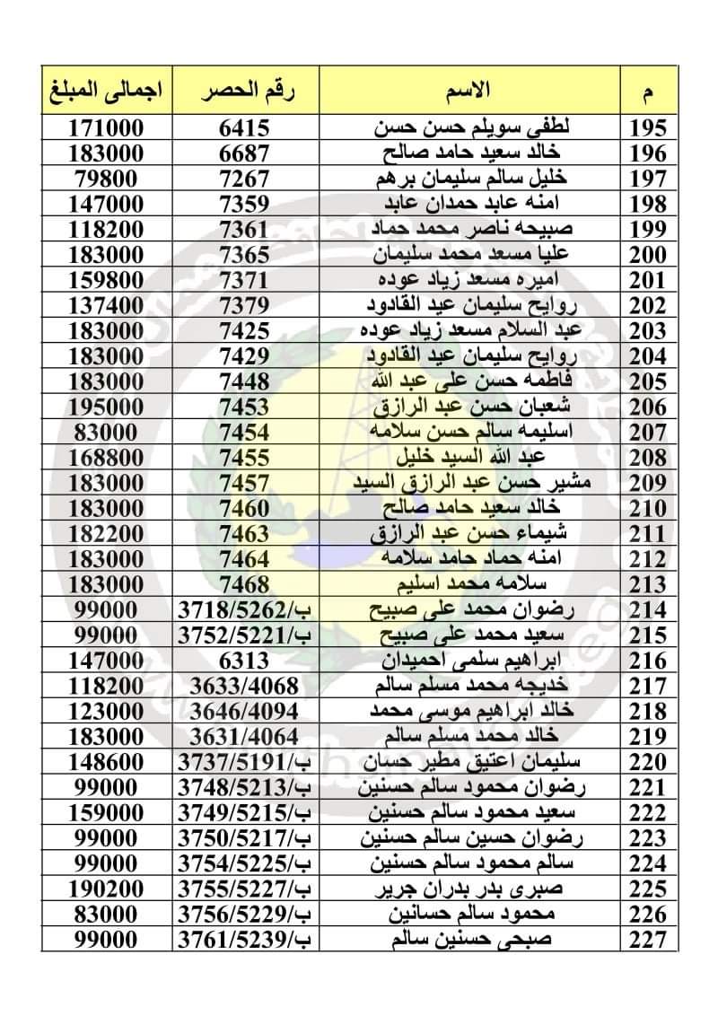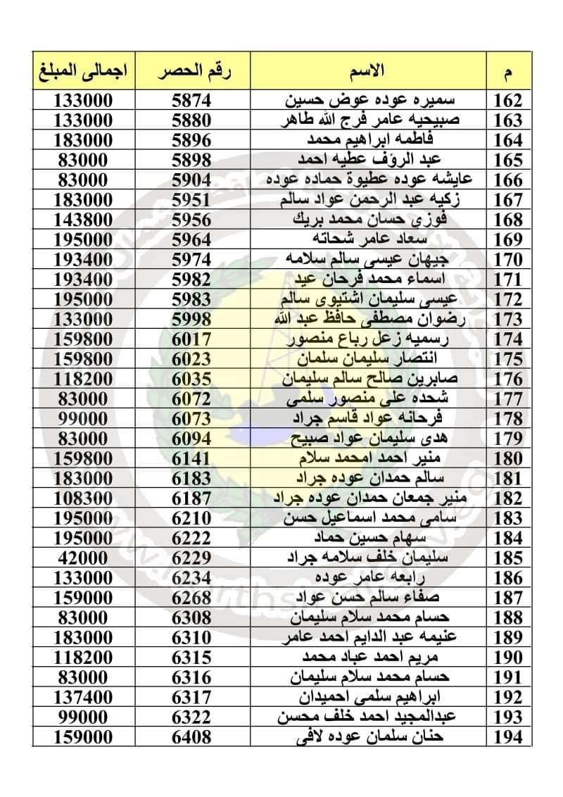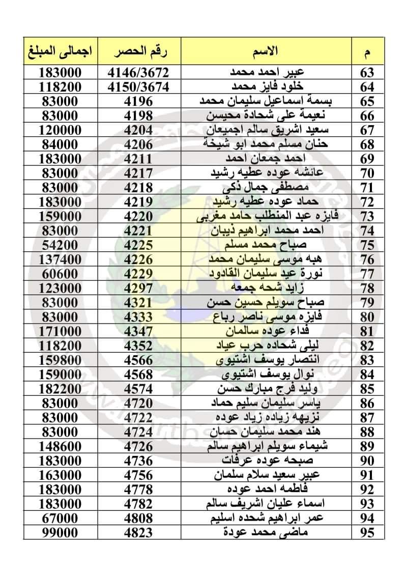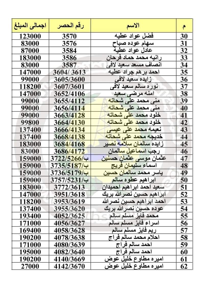 وأعلنت المحافظة عن أسماء 241 مواطنًا للمستحقين للتعويضات برفح على أن يتم الصرف من مركز ومدينة رفح يبدأ بأسم تسنيم سعيد سلامة سلام وينتهي بأسم منصور عيوه سالم.