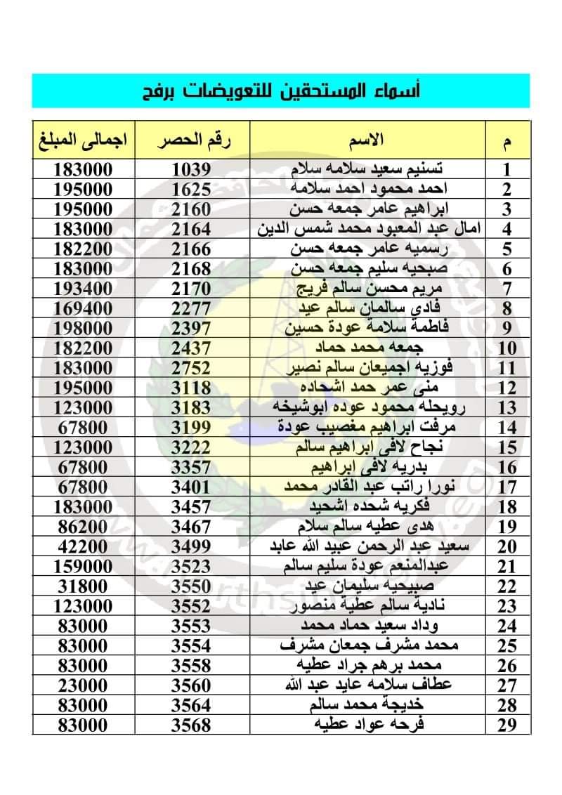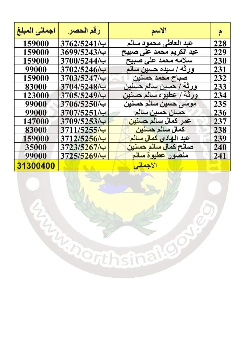 أعلنت محافظة شمال سيناء أسماء المستحقين للتعويضات بمدينة رفح وعددهم 241 مواطنًا.