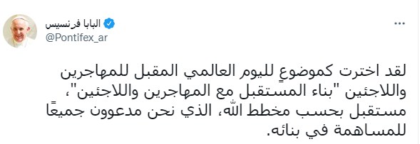 وكتب البابا فرنسيس تغريدة على تويتر "لقد اخترت كموضوعٍ لليوم العالمي المقبل للمهاجرين واللاجئين "بناء المستقبل مع المهاجرين واللاجئين"، مستقبل بحسب مخطط الله، الذي نحن مدعوون جميعًا للمساهمة في بنائه"