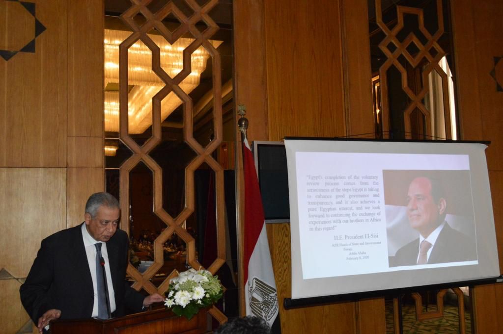 وشهدت الفعّالية قيام السفير حمدي سند لوزا، نائب وزير الخارجية للشئون الإفريقية، بإلقاء كلمة أكد فيها حرص مصر على دعم آلية مراجعة النظراء في ضوء محورية دورها في تعزيز قيم الحكم الرشيد والتنمية المستدامة، مشيرًا إلى أن مصر تعد من الدول المؤسسة للآلية، كما استعرض الجهود الحكومية للإصلاح الاقتصادي ومحاربة الفساد وإرساء دولة القانون وتحسين الظروف الاقتصادية والاجتماعية للمواطنين، اتساقًا مع أهداف التنمية المستدامة للأمم المتحدة وأجندة الاتحاد الأفريقي للتنمية.