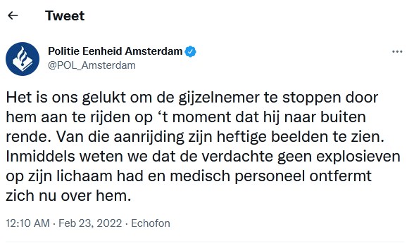 أعلنت الشرطة الهولندية، مساء الثلاثاء، انتهاء عملية احتجاز الرهائن في متجر “آبل ستور” في العاصمة أمستردام، والتي استمرت ساعات عدة موضحة أن القوى الأمنية أوقفت الرجل المسلح.