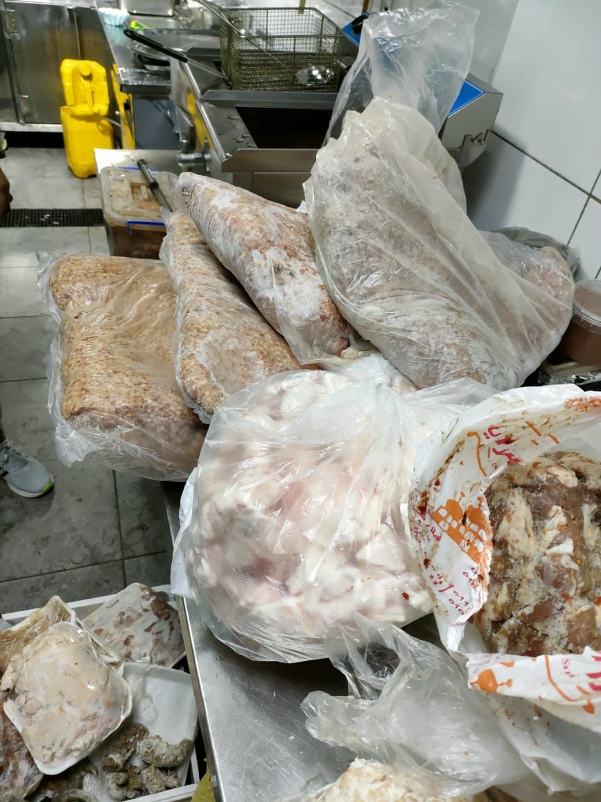 وبتفتيش المطعم عثر بداخله على 200 كيلوجرام "لحوم، دهون، مقطعات دواجن" مجهولة المصدر وغير مصحوبة بأية مستندات تدل على مصدرها.
