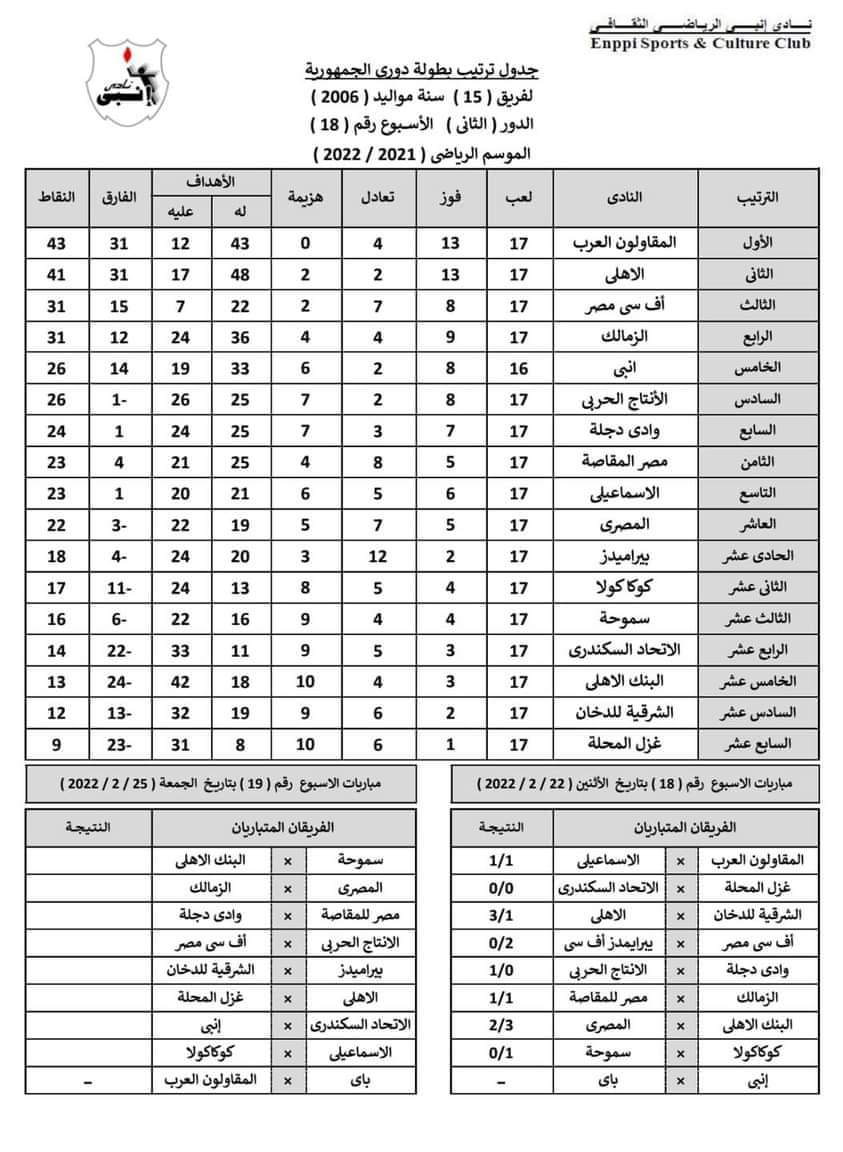 المقاولون يتصدر.. جدول ترتيب دوري الجمهورية للناشئين 2006