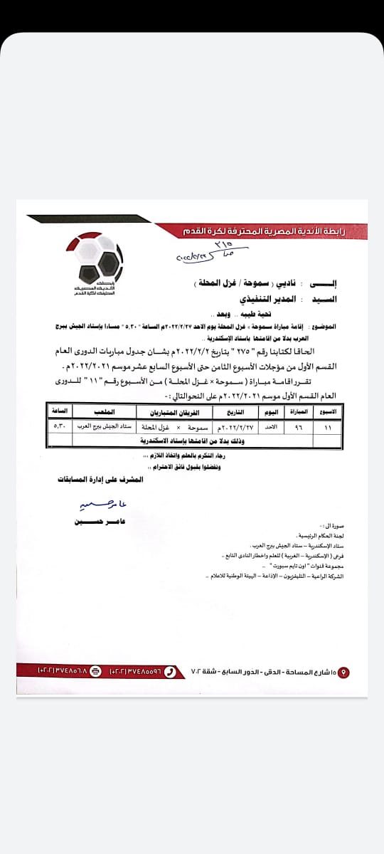 ويوم السبت 30/4 مع غزل المحلة في الخامسة والنصف بستاد الجيش.