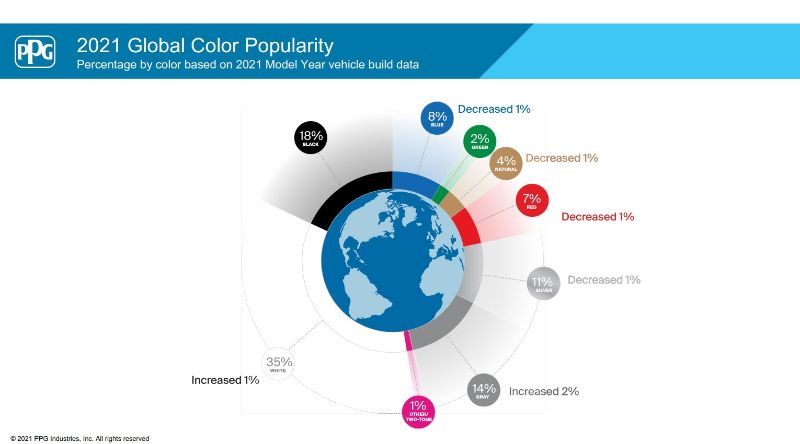 ووفقا لما أعلنتها PPG تقريرها، عن ألوان السيارات، والذي وجد أن اللون الأبيض هو أكثر ألوان السيارات شعبية على مستوى العالم، حيث مثلت نسبة اللون 35% من سيارات العام الماضي، وهو لون تقليدي يُنظر له على أنه خيار آمن، وهاكم القائمة كاملة.