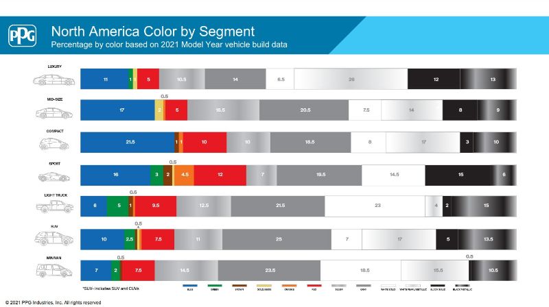 ليس من المستغرب أن تختلف تفضيلات الألوان باختلاف قطاع السيارات، فمثلًا السيارات المدمجة تأتي باللون الأزرق بنسبة 21.5% في أمريكا الشمالية، في حين أن اللون الأحمر هو الأكثر شيوعًا في السيارات الرياضية، بينما كان اللون الأخضر أكثر شيوعًا في سيارات البيك آب.
