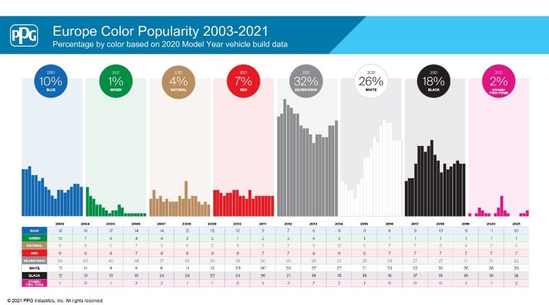 يأتي بعد الأبيض اللون الأسود بنسبة تُمثل 18% من السيارات المصنعة في 2021، وأكملت المراكز الخمسة الأولى اللون الرمادي بنسبة 14% والفضي 11% والأزرق 8%، وفي حين أن الألوان الأكثر شيوعًا كانت باهتة نسبيًا، فقد أكد التقرير أن هناك تزايد في شعبية الرمادي والأزرق والأخضر والبنفسجي.