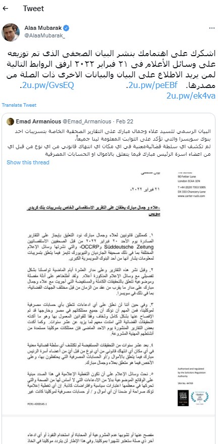 وأعاد علاء مبارك نشر تغريدة تضمنت البيان وقال لصاحبها: "أشكرك على اهتمامك بنشر البيان الصحفى الذى تم توزيعه على وسائل الإعلام فى ٢١ فبراير ٢٠٢٢ أرفق الروابط التالية لمَن يريد الاطلاع على البيان والبيانات الأخرى ذات الصلة من مصدرها"، حسب قوله.