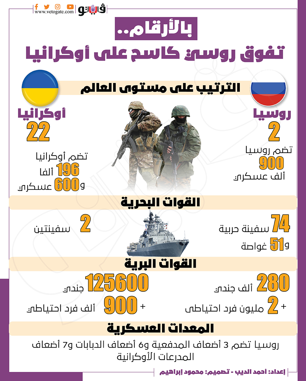 بالأرقام.. تفوق روسي كاسح على أوكرانيا | إنفوجراف الخميس 24/فبراير/2022 - 01:06 م 2/24/2022 1:06:44 PM تفوق روسي كاسح على أوكرانيا أحمد الديب شارك طباعة 18 حجم الخط شارك طباعة