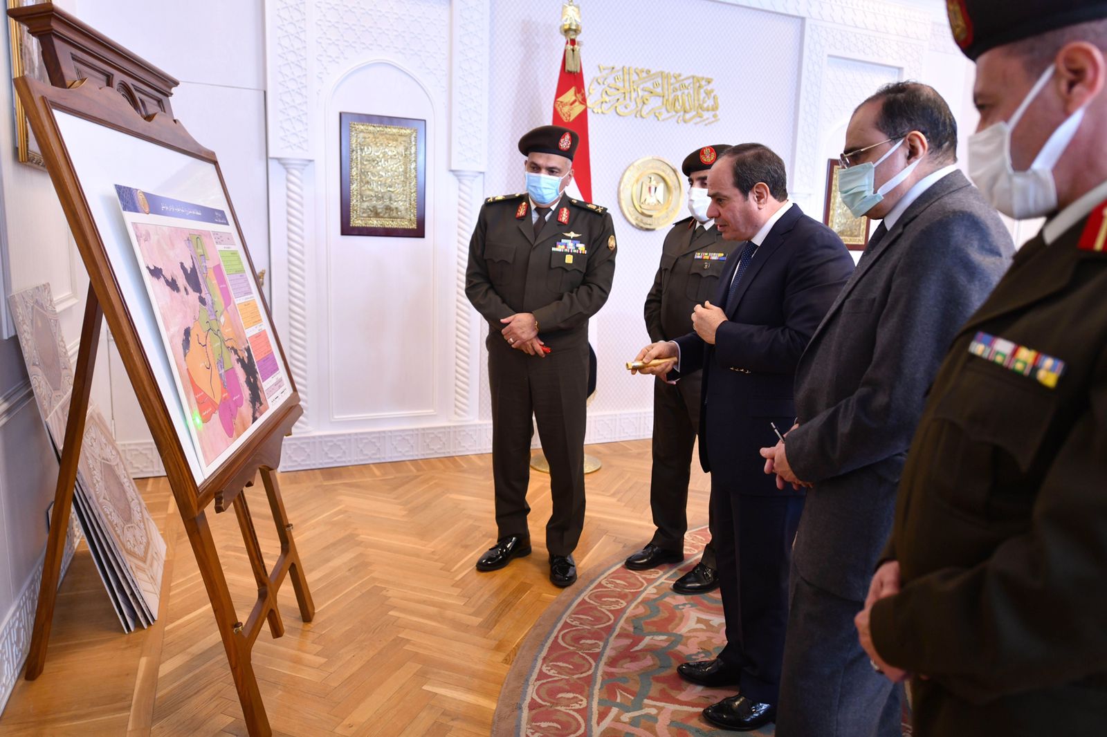 كما تم استعراض الموقف الإنشائي والهندسي لعدد من المنشآت بالعاصمة الإدارية الجديدة، خاصةً مسجد مصر، والتصميمات الهندسية للجداريات والقاعات به، لاسيما قاعة "دار القرآن الكريم"، فضلًا عن عرض الموقف التنفيذي لكلٍ من ساحة الشعب وساري العلم، وكذلك القيادة الاستراتيجية.
