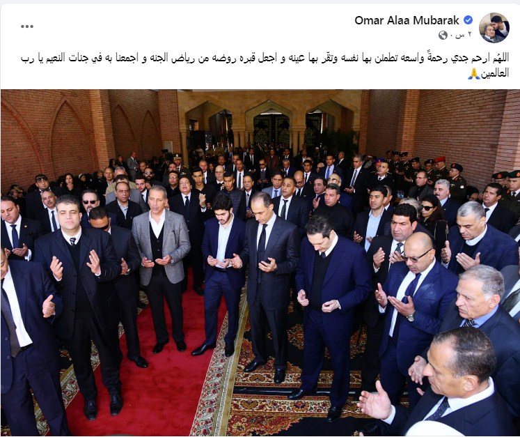 وقال حفيد مبارك على صفحته بـ"فيس بوك": "اللهُم ارحم جدي رحمةً واسعة تطمئن بها نفسه وتقّر بها عينه، واجعل قبره روضة من رياض الجنة، واجمعنا به في جنات النعيم يا رب العالمين".