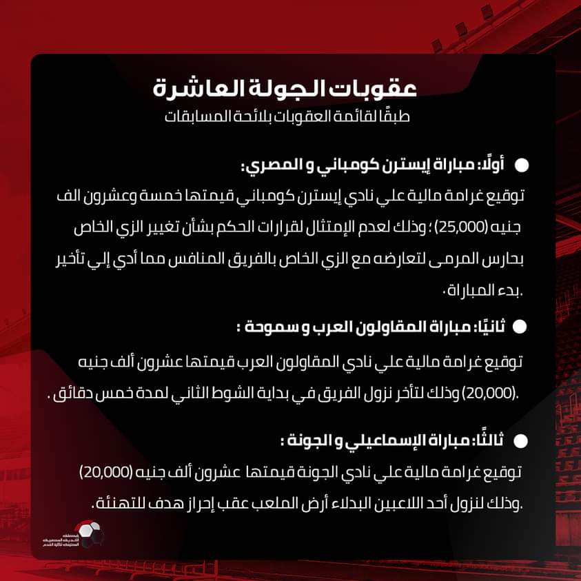 أعلنت رابطة الأندية عقوباتِ الجولة العاشرة لمسابقة الدوري الممتاز والتي شملت توقيع غرامات مالية تقدَّر بـ65 ألف جنيه على ثلاثة أندية.
