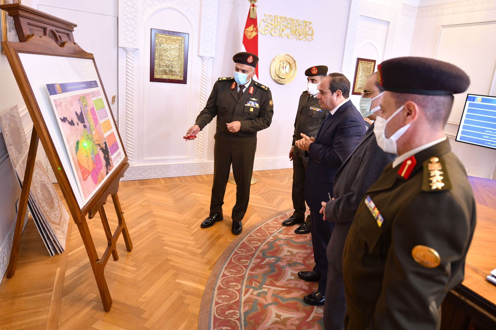 كما تم استعراض الموقف الإنشائي والهندسي لعدد من المنشآت بالعاصمة الإدارية الجديدة، خاصةً مسجد مصر، والتصميمات الهندسية للجداريات والقاعات به، لاسيما قاعة "دار القرآن الكريم"، فضلًا عن عرض الموقف التنفيذي لكلٍ من ساحة الشعب وساري العلم، وكذلك القيادة الاستراتيجية.