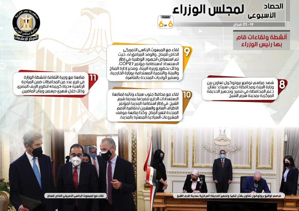 بروتوكول تعاون بين وزارة البيئة ومحافظة جنوب سيناء؛ بشأن دعم المحافظة في تنفيذ وتجهيز الحديقة المركزية بمدينة شرم الشيخ، فضلًا عن متابعة رئيس الوزراء مع وزيرة الثقافة لأنشطة الوزارة في قرى عدد من المحافظات ضمن المبادرة الرئاسية "حياة كريمة" لتطوير الريف المصري، وذلك خلال شهري ديسمبر ويناير الماضيين.
