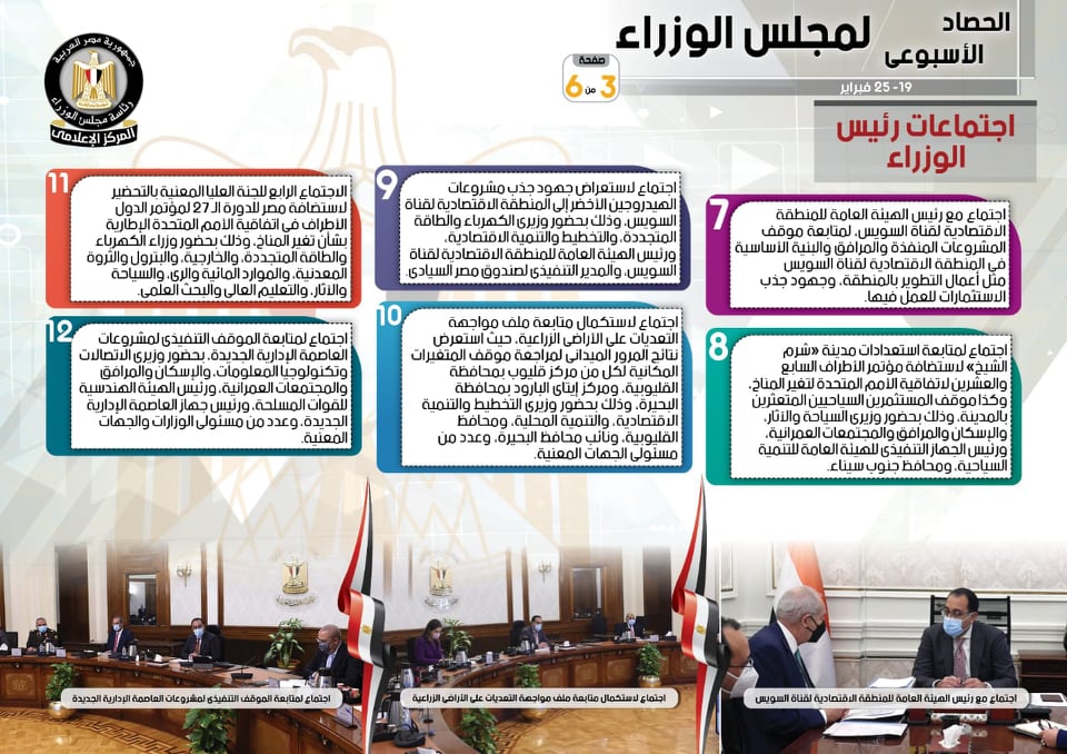 نشر المركز الإعلامي لمجلس الوزراء، تقريرًا شمل إنفوجرافات سلط من خلالها الضوء على الحصاد الأسبوعي لمجلس الوزراء، وذلك خلال الفترة من 19 حتى 25 فبراير 2022، والذي تضمن الموافقة على عدد من القرارات، فضلًا عن الاجتماعات واللقاءات التي عقدها الدكتور مصطفى مدبولي، رئيس مجلس الوزراء، بالإضافة إلى ما قام به من أنشطة.