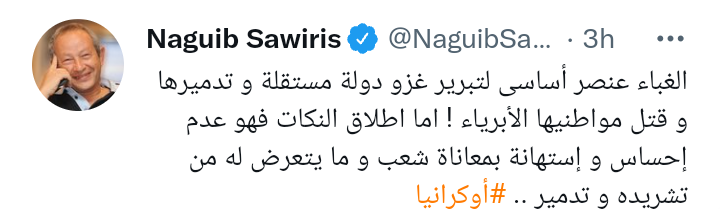 أعرب رجل الأعمال المهندس نجيب ساويرس عن استيائه بسبب سخرية البعض من الحرب علي أوكرانيا.