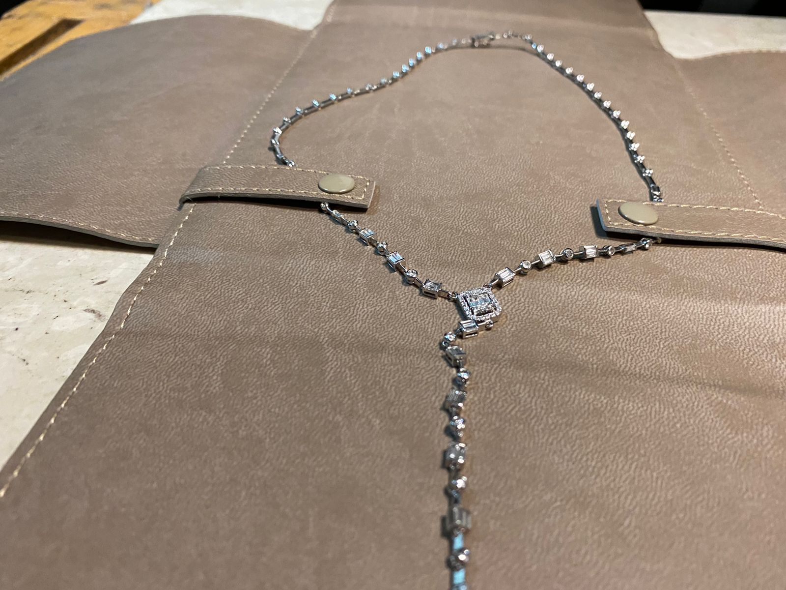 كما تبين وجود فاتورة شراء كوليه حريمى بتفتيشه ذاتيا تبين أنه يرتدى الكوليه الحريمى المرصع بفصوص الألماظ حول عنقه بوزن ١٨ جرام.