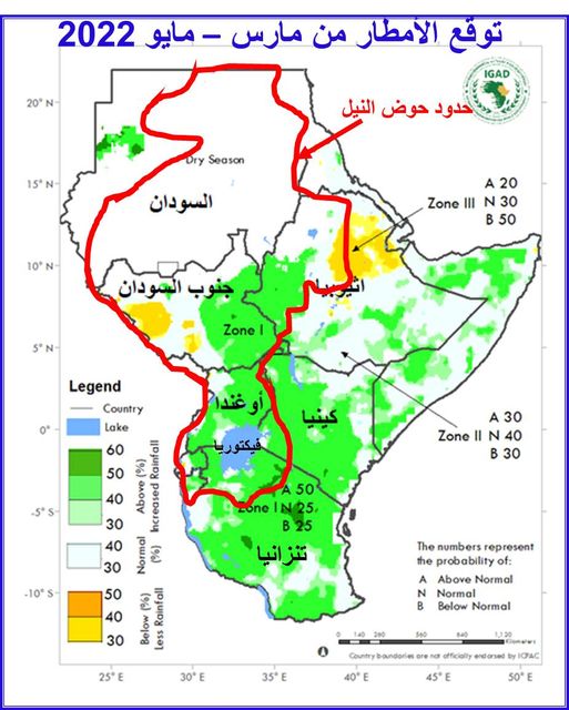 كشف الدكتور عباس شراقي، أستاذ الجيولوجيا والموارد المائية في جامعة القاهرة، أنه طبقًا لمركز تنبؤ المناخ IGAD وتطبيقاته لشرق أفريقيا (ICPAC) من المتوقع أن تكون الأمطار أعلى من المعدل في منطقة منابع النيل الاستوائية حول بحيرة فيكتوريا خلال الثلاثة أشهر القادمة (مارس - مايو) التى تمد النيل بحوالي 15% فقط من إيراده السنوي، بينما الجزء الأكبر 85% يأتي من الهضبة الإثيوبية الذى يسقط عليه الأمطار من يوليو إلى سبتمبر.