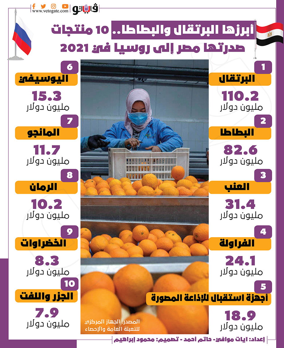 أبرزها البرتقال والبطاطا.. 10 منتجات صدرتها مصر إلى روسيا في 2021| انفوجراف السبت 26/فبراير/2022 - 05:07 م 2/26/2022 5:07:38 PM الصادرات المصرية آيات الموافي - حاتم أحمد شارك طباعة 18 حجم الخط شارك طباعة روسيا الصادرات المصرية الصادرات المصرية لروسيا البرتقال أجهزة استقبال للإذاعة المصورة