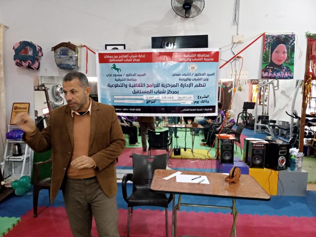 وفى إطار خطة أندية التطوع بالمركز وبمحافظة الشرقية بدأت الدورة التدريبية لإعداد قادة شباب من أندية التطوع داخل الأندية وذلك للدفع بجيل جديد من الشباب داخل أندية التطوع وذلك فى تمام الساعة الثالثة عصرا بمركز شباب المستقبل.