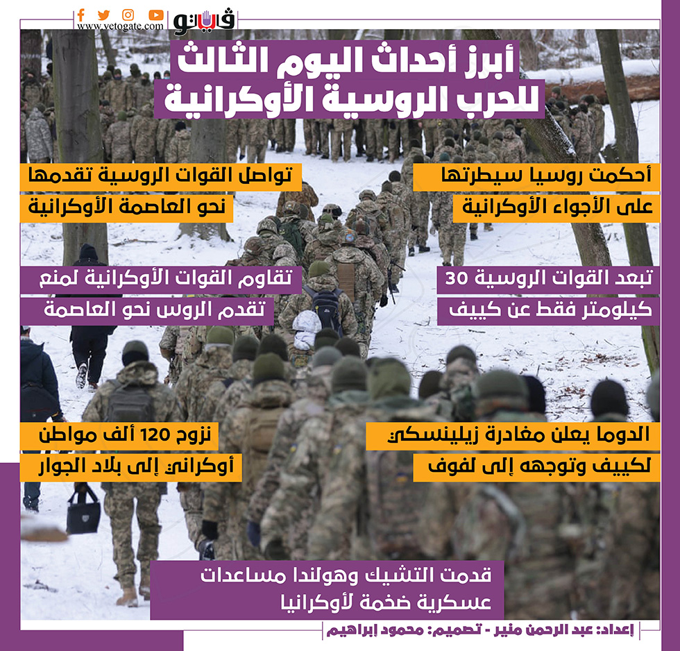 أبرز أحداث اليوم الثالث للحرب الروسية الأوكرانية | انفوجراف السبت 26/فبراير/2022 - 05:23 م 2/26/2022 5:23:02 PM الجيش الروسي عبد الرحمن منير شارك طباعة 18 حجم الخط شارك طباعة الحرب الروسية الأوكرانية القوات الروسية الأوكرانية كييف