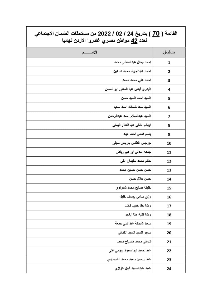 أعلن وزير القوى العاملة، محمد سعفان، أن مكتب التمثيل العمالي التابع للوزارة بالسفارة المصرية بعمان-الأردن، استطاع بالمتابعة اللحظية والجهود المبذولة والمقابلات مع المسئولين بمؤسسة الضمان الاجتماعي بالأردن، واستكمالا لما تم تحويله سابقا، تم تحويل القائمة الـ 70 من مستحقات الضمان الاجتماعي لنحو 42 عامل مصري لدى المؤسسة غادروا عمان نهائيا.