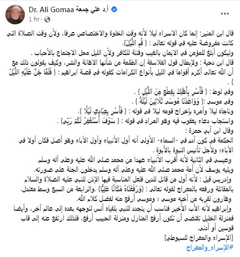 وكتب الدكتور على جمعة تدوينة على الفيس بوك "قال ابن المنير: إنما كان الاسراء ليلا لأنه وقت الخلوة والاختصاص عرفا، ولأن وقت الصلاة التي كانت مفروضة عليه في قوله تعالى: { قُمِ اللَّيْلَ}. وليكون أبلغ للمؤمن في الايمان بالغيب وفتنة للكافر ولأن الليل محل الاجتماع بالأحباب"