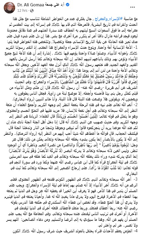 أما عن رحلة الإسراء والمعراج فقال جمعة: "مع مناسبة #الإسراء_والمعراج، جال بفكري عدد من الخواطر الشاملة تتناسب مع جلل هذا الحدث وانفراده في تاريخ البشرية، فالمرحلة التي قام بها ﷺ في إسرائه إلى بيت المقدس، ثم معراجه إلى ما فوق السموات السبع لينتهي به المطاف عند سدرة المنتهى في عدة دقائق محدودة، ليعود فيجد فراشه مازال دافئا أمر لم يتكرر مرة أخرى مع بشر"