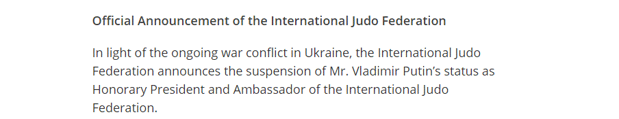 في ضوء الصراع الدائر في أوكرانيا، أعلن الاتحاد الدولي للجودو تعليق منصب السيد فلاديمير بوتين كرئيس فخري وسفير للاتحاد الدولي للجودو.