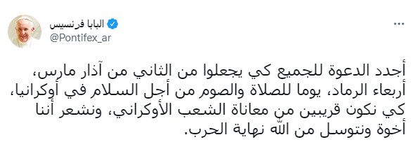 وكتب البابا فرنسيس تغريدة على تويتر "أجدد الدعوة للجميع كي يجعلوا من الثاني من آذار مارس، أربعاء الرماد، يوما للصلاة والصوم من أجل السلام في أوكرانيا، كي نكون قريبين من معاناة الشعب الأوكراني، ونشعر أننا أخوة ونتوسل من الله نهاية الحرب"
