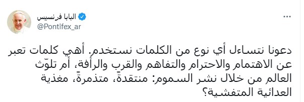 وقال "دعونا نتساءل أي نوع من الكلمات نستخدم. أهي كلمات تعبر عن الاهتمام والاحترام والتفاهم والقرب والرأفة، أم تلوّث العالم من خلال نشر السموم: منتقدةً، متذمرةً، مغذية العدائية المتفشية؟"