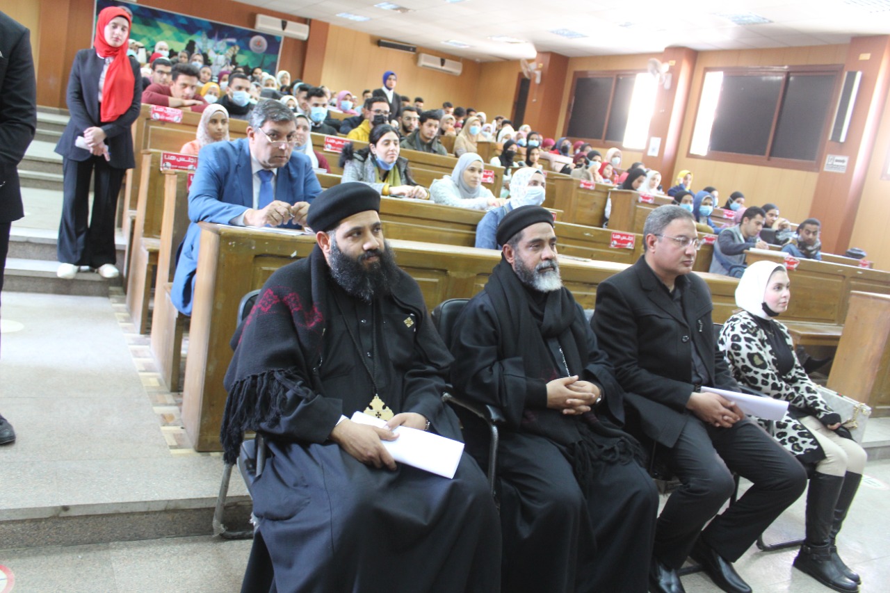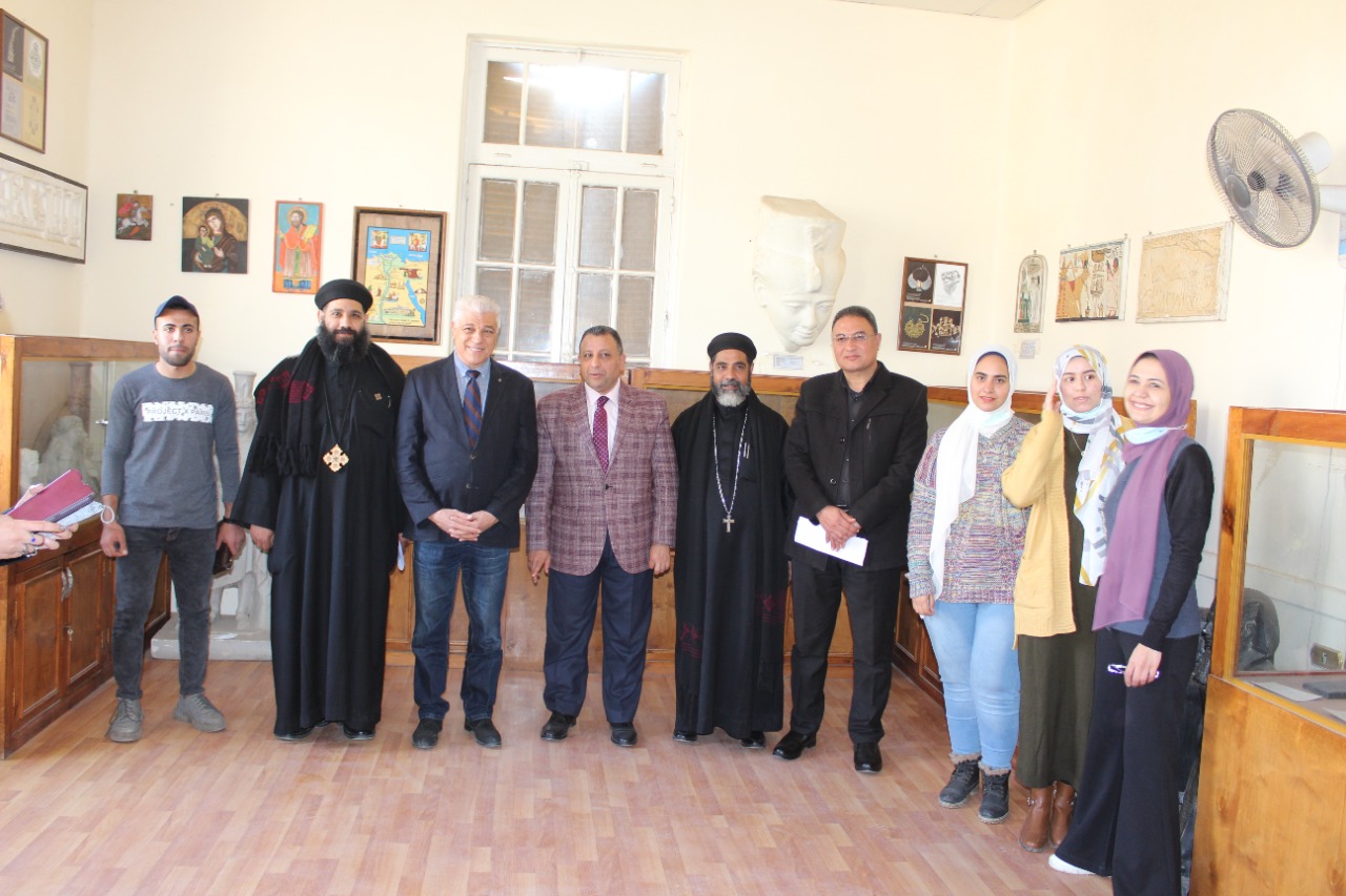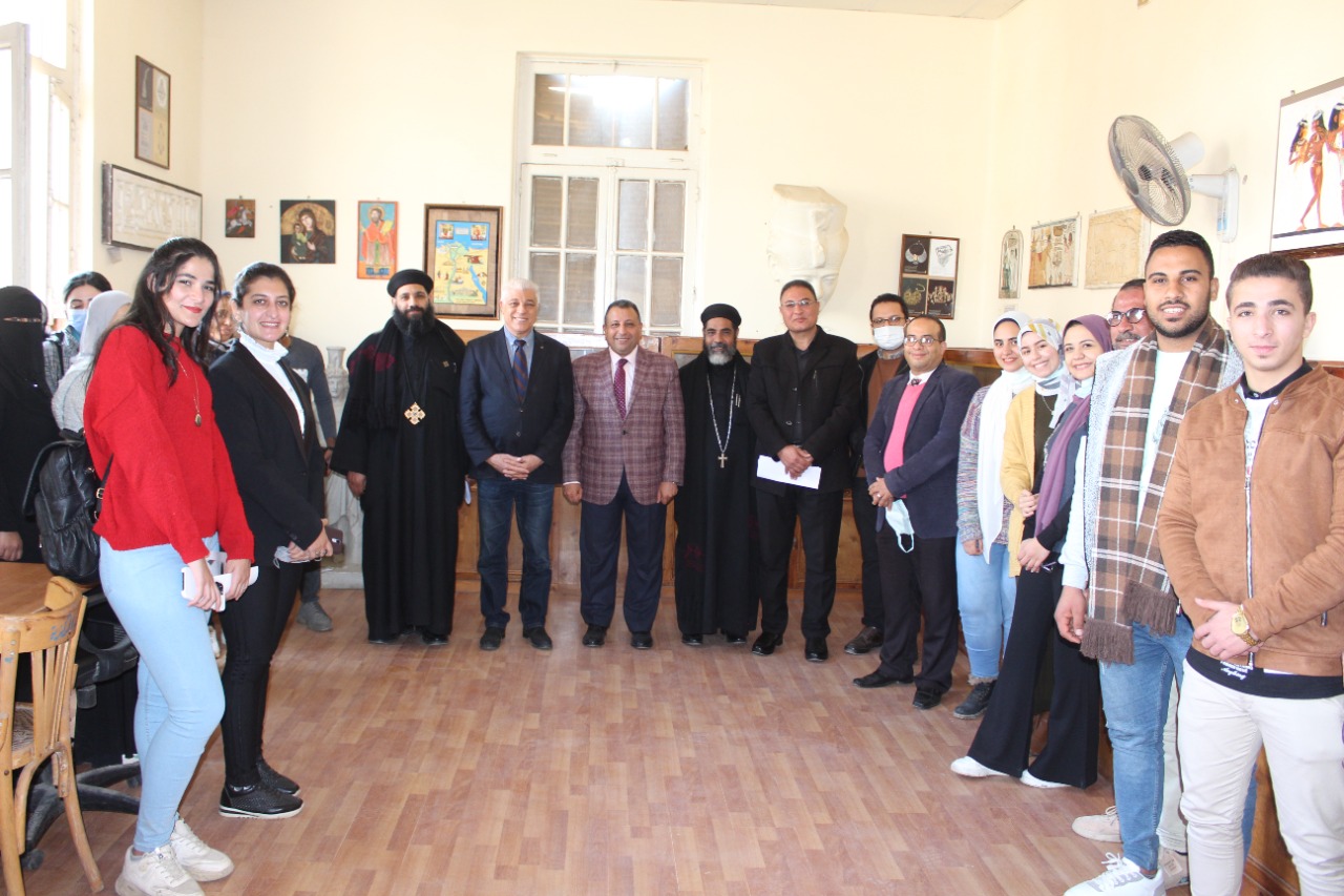 وبحضور القمص ديسقورس شحاته وكيل المطرانية بدير القديسة دميانة والقمص فيبلس سعد كاهن كنيسة القديسة دميانة والدكتور محمد الحسينى طمان مدير عام مناطق اثار الوجه البحرى وسيناء وناجى وليم رئيس تحرير جريدة المشاهير والسيدة مونيكا مجدى الإعلامية بقناة سى بى سى ولفيف من رؤساء الأقسام العلمية وأعضاء هيئة التدريس بالكلية.
