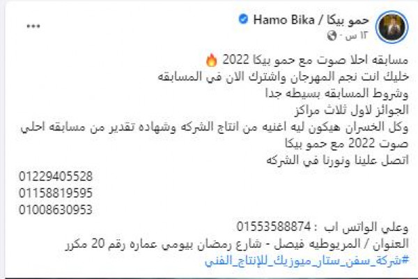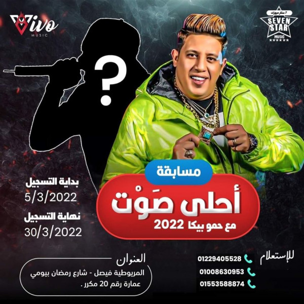 ونشر حمو بيكا الملصق الدعائي الخاص بالمسابقة عبر حسابه الخاص على موقع التواصل الإجتماعي (فيس بوك)، وكتب معلقًا: "مسابقه احلا صوت مع حمو بيكا 2022.. خليك انت نجم المهرجان واشترك الان في المسابقه.. وشروط المسابقه بسيطه جدا.. الجوائز لأول ثلاث مراكز.. وكل الخسران هيكون ليه اغنيه من انتاج الشركه وشهاده تقدير من مسابقه احلي صوت 2022 مع حمو بيكا.. اتصل علينا ونورنا في الشركة".