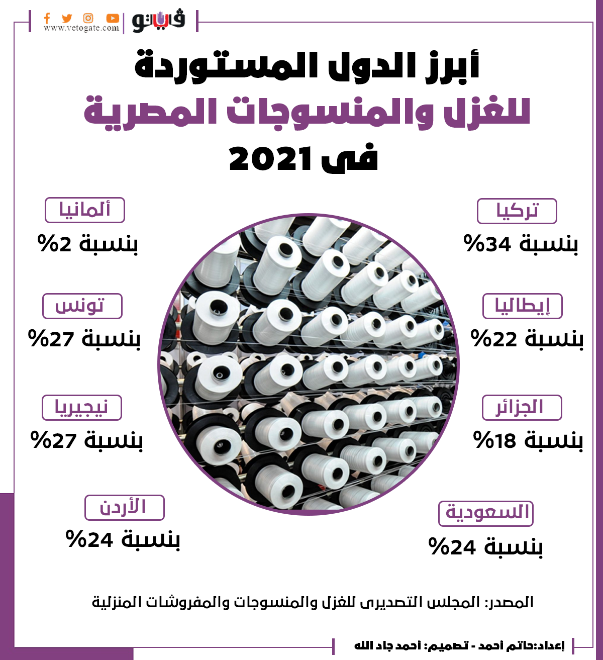 أبرز الدول المستوردة للغزل والمنسوجات المصرية فى 2021|إنفوجراف الأربعاء 02/مارس/2022 - 11:36 ص 3/2/2022 11:36:53 AM الغزل والنسيج حاتم أحمد شارك طباعة 18 حجم الخط شارك طباعة الغزل والنسيج تركيا صادرات الغزل والنسيج السعودية المجلس التصديري للغزل والمنسوجات