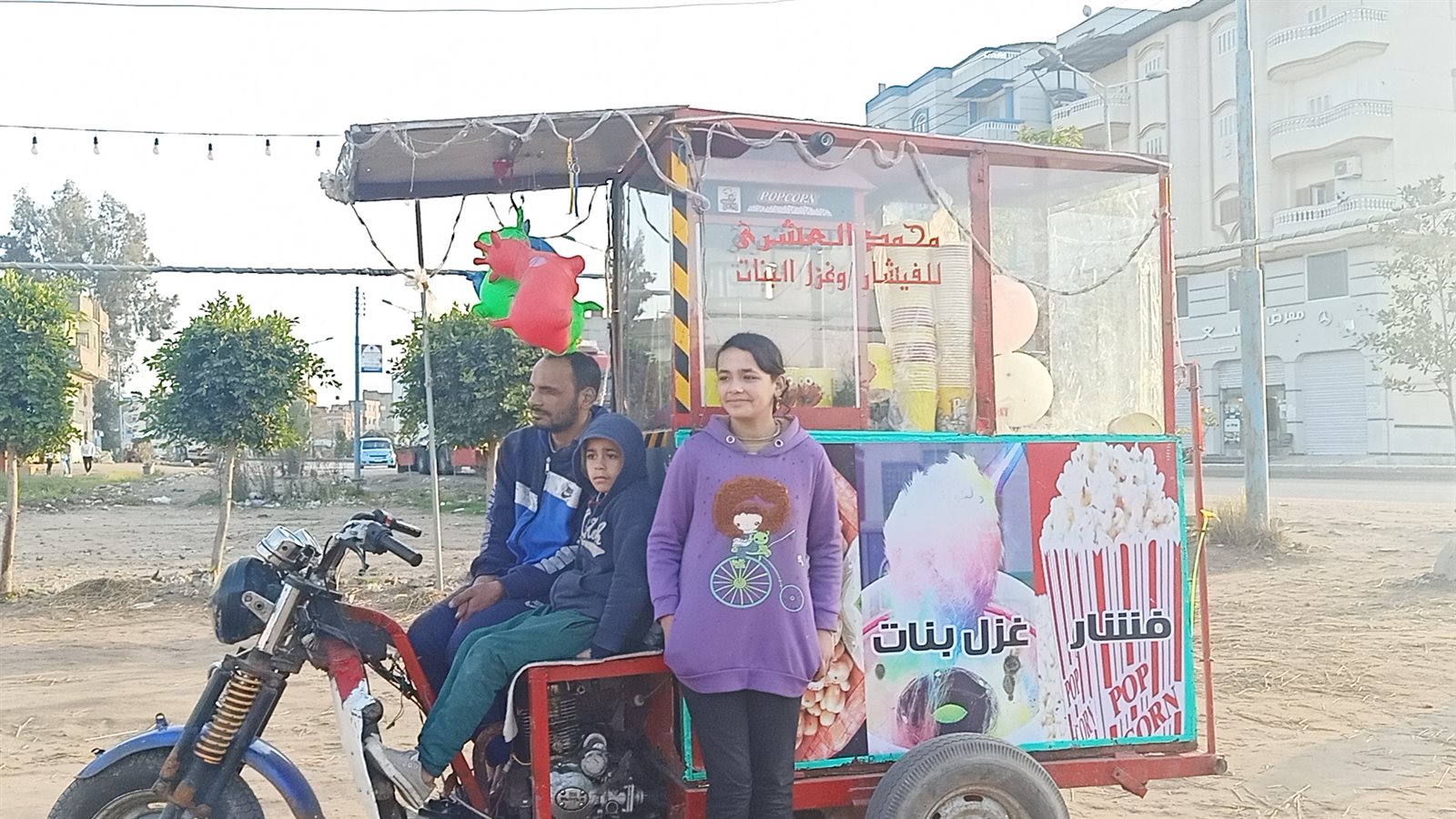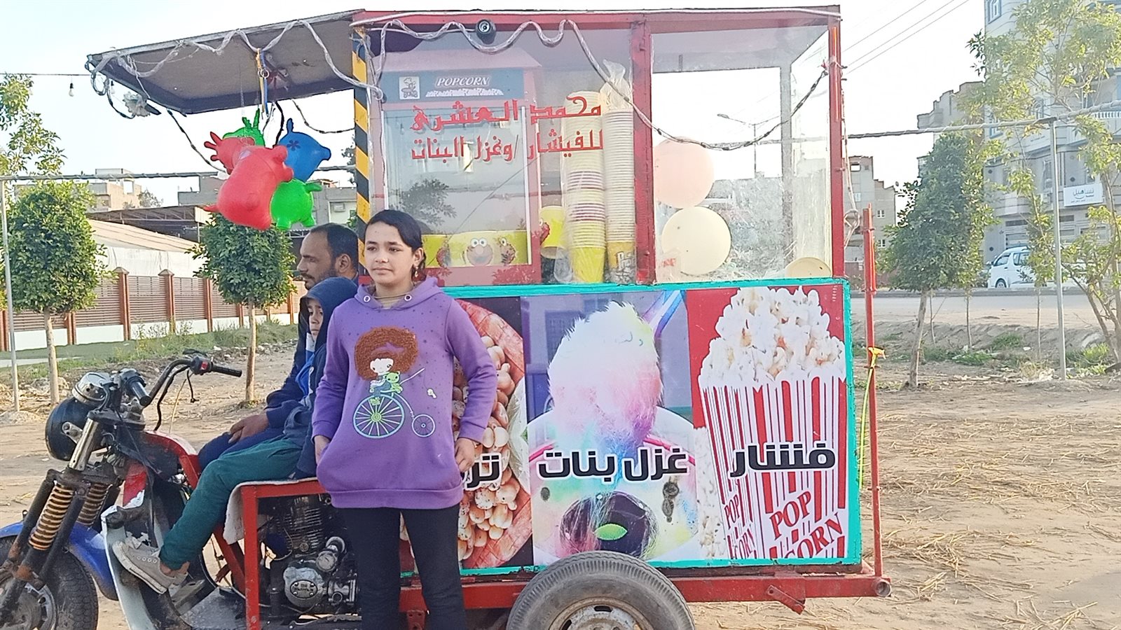 بابتسامتها الطفولية البريئة تمارس فاطمة محمد العشري ابنة الـ 12 عاما في مركز الجمالية بمحافظة الدقهليةكفاحها بالعمل علي دراجة نارية" تروسيكل" لبيع الفيشار لمساعدة والدها الذي فقد بصره منذ ان كان طفلا بالمرحلة الابتدائية، لتكون هي السند والعون.
