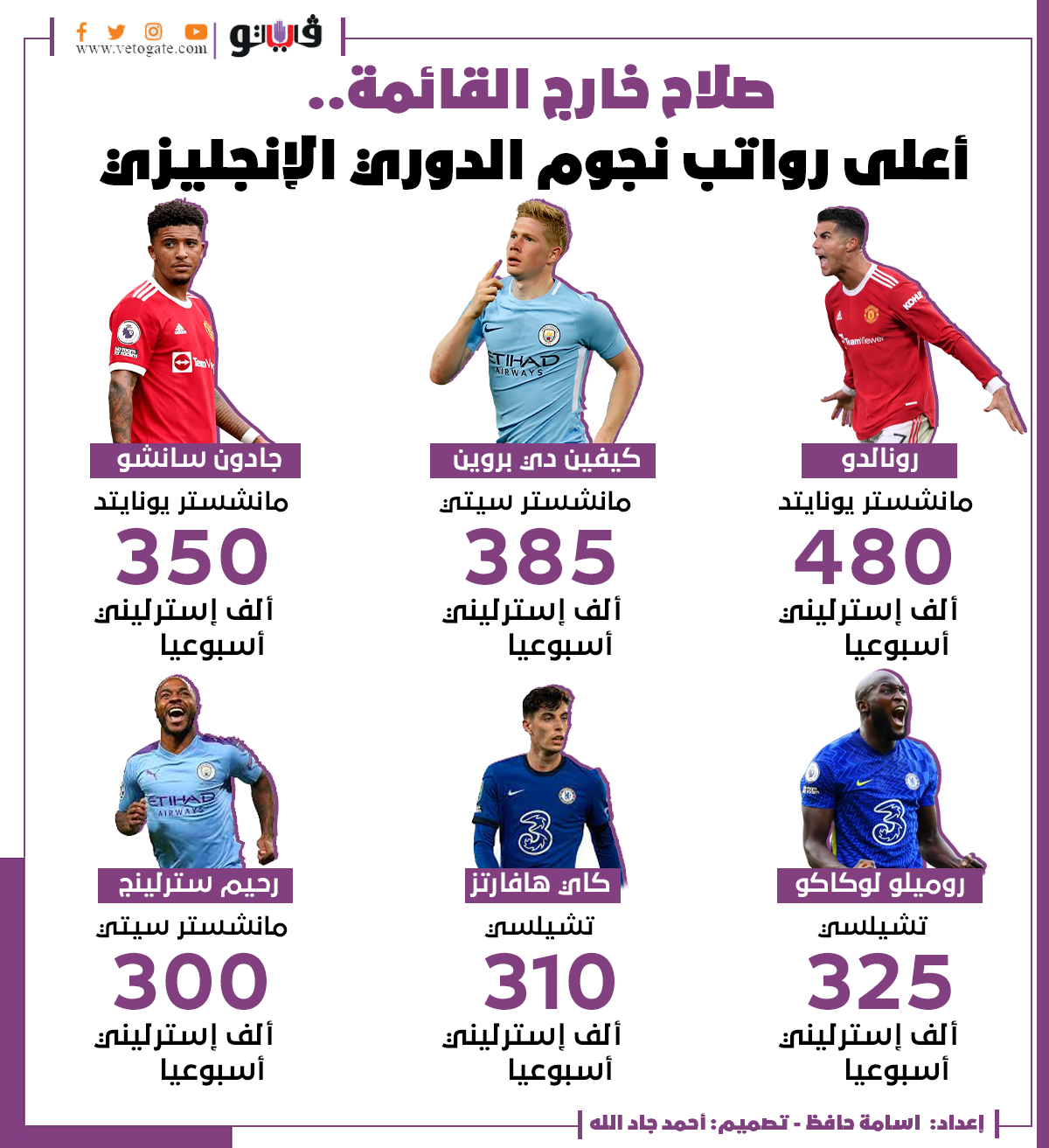 صلاح خارج القائمة.. أعلى رواتب نجوم الدوري الإنجليزي|إنفوجراف الثلاثاء 01/مارس/2022 - 02:35 م 3/1/2022 2:35:58 PM رونالدو اسامة حافظ شارك طباعة 18 حجم الخط شارك طباعة جادون سانشو كيفين دى بروين مانشستر سيتي مانشستر يونايتد أجور اللاعبين الدوري الانجليزي